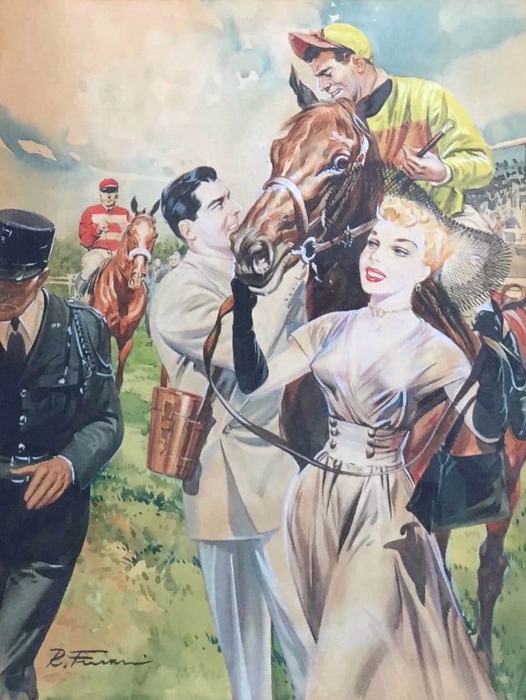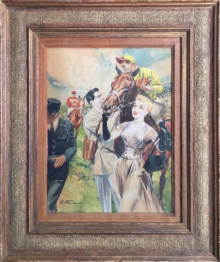 An unidentified but clearly signed French illustration of a winning horse and glamorous owner in watercolour. In a handmade gilt and gesso frame. Presumable drawn for a magazine article of book cover. Really stunning quality. Images measures 14" x 10" ins plus 3-4 inches for the frame. More stock on Instagram @phdstock